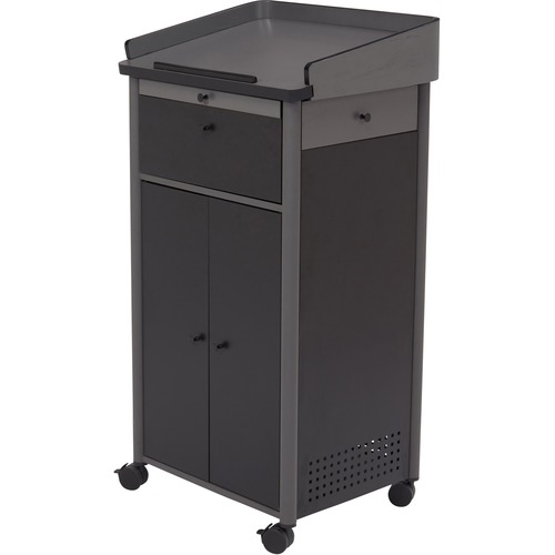 The Greystone Lectern from Oklahoma Sound is far more than just a basic lectern. This elegantly designed unit offers an all-in-one presentation experience. Large reading surface (22.75"W x 18.25"D), two side pull-out shelves (14.25"W x 12"D), and a sliding keyboard tray (17.5"W x 9.25"D) provides for a complete multi-media presentation experience. Designer curved grey plywood adds a sophisticated look. The cabinet includes three large shelves plus an oversized front drawer for ample storage. 2.5" hooded twin wheel matching casters makes for easy mobility. Elegance & functionality for all your presentation needs. Designer Curved Grey Plywood Steel Cabinet and Hooded Twin Wheel Matching Casters Large Reading Surface and Pull Out Shelves 10 Year Warranty