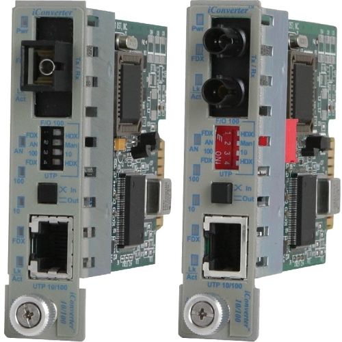 The iConverter 10/100 managed media converters are members of the modular iConverter product family, and provide 10BASE-T or 100BASE-TX to 100BASE-FX fiber conversion.The iConverter 10/100 modules are available with multimode, single-mode and single-fiber options, and support ST, SC and LC connectors. The UTP port supports 10/100 and Half/Full-Duplex auto-negotiation with both hardware and software manual override. A UTP crossover switch eliminates the need for a crossover cable and facilitates connectivity to network equipment. The 10/100 also features two Ethernet Backplane ports to provide connectivity to adjacent modules for network expansion and for in-band connectivity to an iConverter Network Management Module.