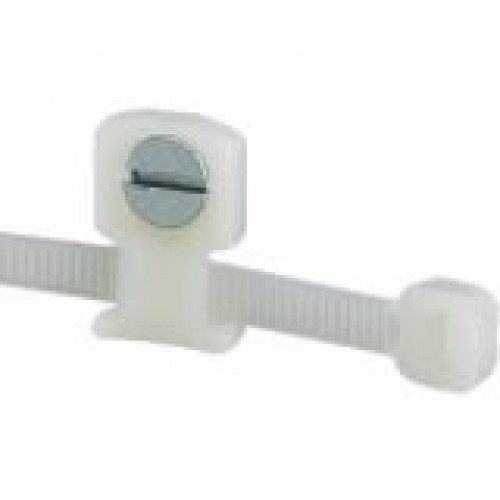 The low profile cable tie mount in natural color is applied with a #8 (M4) screw. It is made of nylon 6.6, which increases mechanical strength, heat and wear resistance, and stiffness. It is used with miniature, intermediate, and standard cable ties. It is designed for indoor environments and comes in packages of 1000.