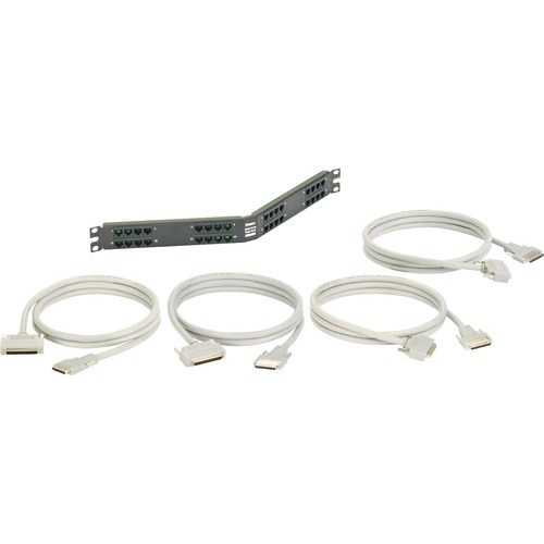 32-port angled patch panel with 32 RJ45 ports wired to four 68 pin SCSI connectors kitted with four cable assemblies each 6 ft. long with 68-pin DB68 male plug on one end, and 68-pin VHD68 male plug on the other.