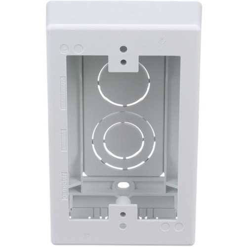 The low voltage junction box for surface raceway is a one gang snap together outlet box designed for low voltage applications. It is made to be used with the T45 or LD profile raceway. It accepts Pan-Way® Screw-On Faceplates or any NEMA standard single gang faceplate. It measures 5 inches L x 3.26 inches W x 1.62 inches H (127.1mm x 82.7mm x 41.1mm). It is made of PVC material and is white.