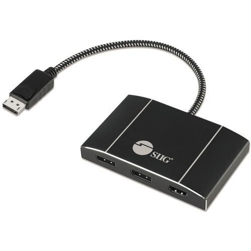 Easily connect up to 2 DisplayPort and 1 HDMI displays from a single DisplayPort 1.4 output Boost your productivity by connecting two DisplayPort and one HDMI displays to single DisplayPort output with Multi-Stream Transport (MST) technology Provides multiple display modes for various applications such as Mirror mode same content on each display, Extended mode with individual content on each display, and Panoramic Video Wall mode which combines multiple monitors to use as one large display Note: Mirror mode using a NVIDIA Surround technology graphics adapter is limited to 2 displays. Video Wall mode requires either a AMD Eyefinity, Intel, or NVIDIA Surround technology graphics adapter Total Bandwidth 32.4Gbps (Max): Supports one UHD 8K (7680 x 4320)@30Hz display, two 4K@60Hz displays, or three 4K (3840x2160)@30Hz or less display. Other resolution combinations which are less than or equal to 4K@30Hz will work also. For example, three 2K, three 1080p, 4K+2K+1080p etc. Note: The total combined bandwidth among all connected displays must NOT be exceeded the total bandwidth Compatible with DisplayPort 1.4 with MST graphics cards with AMD Eyefinity, Intel Collage or NVIDIA Surround technology Supports 4K HDR and HDCP 2.2 Reset button allows re-detection of all the displays if any of the displays are not detected Plug-n-play, trouble-free set up without complicated hardware or driver installation Premium aluminum housing with embedded woven braided DisplayPort cable decreases surrounding interference and provides optimal video quality Notes:1) Mirror mode using Windows Display Utility and NVIDIA Utility is limited to 2 displays2) Video Wall mode (e.g., Panoramic) requires either an AMD Eyefinity, Intel, or NVIDIA Surround technology graphics adapter3) Currently, most Intel HD Graphics cards only support up to 3 external monitors altogether4) macOS currently does not support MST function and will only mirror the displays5) Requires USB power source of at least 5V/600mA