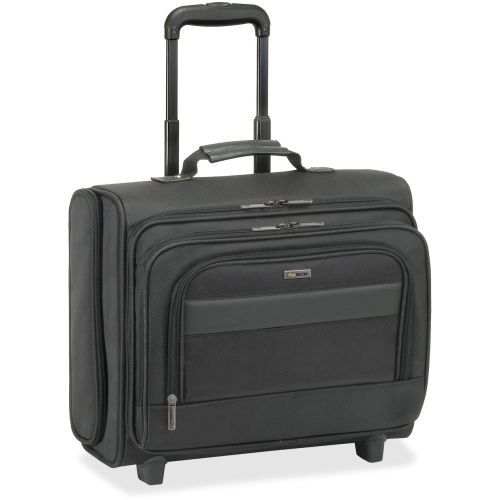 Rolling laptop overnighter holds laptops with 15.6" screens and offers dual-access from the zippered side door or from main compartment. Padded CheckFast sleeve with hook-and-loop closure includes handles for easy removal. Overnighter section features elastic straps with speed buckles to secure overnight articles and a full-length meshed accessory pocket. Zip-down, front organizer contains a cell phone pocket, pen loops, business card holders, and accessory pocket. Front-zippered compartment features an accordion fan file. Transport overnighter laptop case with carry handle and telescoping handle system. Case is made of ballistic poly.