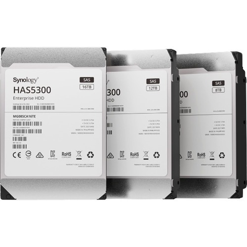 Engineered for top performance and reliability in Synology systems Unmatched integration with DSM and Synology hardware enable HAS5300 SAS hard drives to reliably deliver class-leading performance in enterprise deployments. HAS5300 drives have passed 200,000 hours of rigorous testing on Synology hardware, feature a 2.5M-hour MTTF, and are covered by Synology''s 5-year limited warranty. Performance Up to 274 MB/s sustained data transfer Optimization Up to 27% faster drive repair in Synology NAS Durability Rated for 2.5 million hours MTTF Updates Firmware updates through DSM Enterprise-ready The HAS5300 series drives leverage the low-latency SAS protocol. When paired with high-performance and highly scalable Synology SA or UC series solutions, they ensure that mission-critical workloads always have access to dependable and fast storage. Back to peak performance faster Building on two decades of storage expertise, Synology HAS5300 drives run on firmware optimized for critical workloads that matter. They allow Synology systems to repair degraded RAID arrays up to 27% faster than similar-class and capacity drives. Storage that stands the test of time Validation Rigorous tests and compatibility verification4 ensure maximum reliability on Synology systems, even while handling the most extreme workloads. Simplified maintenance Drive firmware updates are shipped together with DSM updates, easing the burden on IT teams and ensuring your drives are always running the latest firmware versions. Dependable A 2.5 million-hour MTTF , support for up to 550 TB per year workloads, and persistent write cache technology come together to safeguard data integrity. 5-year warranty At Synology, we are committed to product innovation and quality. HAS5300 drives are backed by a 5-year limited warranty that includes technical support and hardware replacement services to maximize your return on investment.