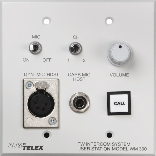The WM-300L Wall Mount User Station works within the TW (Two-Wire) Intercom System as a private listening headset station. It is designed to fit directly into a standard 4-inch square 2-gang electrical conduit box 2.25-inch deep. The rear section is not enclosed and uses the back-box to provide a housing when installed. The user station is perfect for permanent installations where a wall-mounted station can provide an unobtrusive operating position. Most often it is located where the operator can conveniently attend to on-going operations while wearing a headset. A handset can be used in place of a headset, if desired. Practical operating features include 2-channel selection, a latching-action microphone on/off switch, a momentary-action microphone on/off switch, and a headphone volume control. The WM-300L uses a 4-pin dynamic mic headset connector. User-oriented features include a microphone limiter circuit for equalizing levels, a powerful headphone amplifier, silent channel-select switching, and well-placed controls for ease of operation. Most any type of headset may be used with the WM-300L; low-Z or high-Z headphones, with dynamic or carbon microphone. The carbon microphone headset port also accepts Plantronics telephone-type headsets. Screw terminals mounted on the circuit board are provided for user station interconnection to the line. A 2-pair shield cable, such as Belden 8723 or equivalent is recommended since it allows each channel to be carried over a separate shielded pair, reducing the possibility of crosstalk between channels.