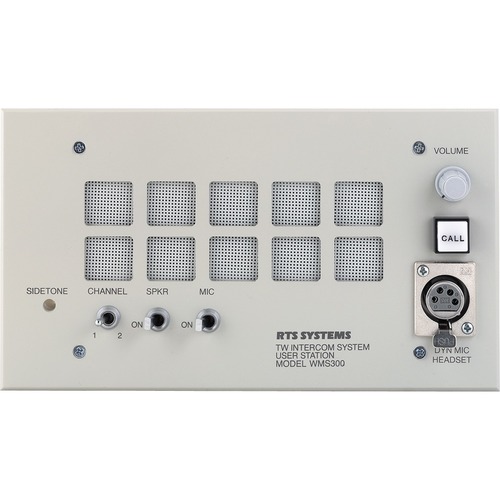 Two-channel select wall mount speaker user station. Can be used as a "public" listen box via built in speaker or privately through the headset connection. Features channel select switch, call light, speaker on/off switch and dual purpose volume control. Fits in standard US 4-gang outlet box.