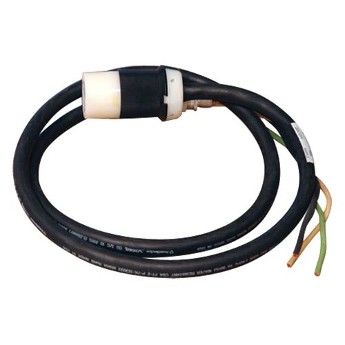 208/240V single phase whip with L6-30R outlet distributes power from 3 phase distribution cabinet to critical equipment racks. 10 ft. insulated and 3 ft. of removed outer jacket cabling supports hardwire connection to SUBB230 circuit breaker in SUDC208V42P 3 phase distribution rack. L6-30R outlet is compatible with 208/240V loads and Power Distribution Units (PDUs) supporting a L6-30P plug-in connection.