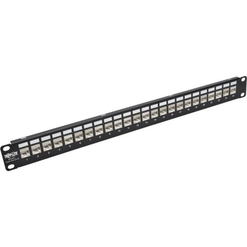 The N254-024-SH-D 24-Port 1U Rack-Mount STP Shielded Cat5e/6 Feedthrough Patch Panel features RJ45 ports that point downward at a 90-degree angle to ease cable installation in hard-to-reach places. It meets or exceeds Cat6 specifications and works with USOC, T568A and T568B wiring to comply with industry standards. It''s ideal for MDFs (main distribution frames) and IDFs (intermediate distribution frames) where quick patching changes are necessary.Made from heavy-duty 14ga cold-rolled steel, the N254-024-SH-D manages and organizes the cabling in your high-density network with no 110 punchdown termination required. Just plug your Cat5e/6 cables into the 24 fully shielded RJ45 coupler jacks on both sides of the panel. Ports are clearly numbered to help you identify connections. Mounts easily into 1U of an EIA-standard 19-inch rack. Grounding wire included. Compliant with the Federal Trade Agreements Act (TAA) for GSA Schedule purchases. Features Manages and Organizes High-Density Network Cabling Meets or exceeds Cat6 specifications Heavy-duty 14ga cold-rolled steel construction Works with USOC, T568A and T568B wiring to comply with industry standards Ideal for MDFs and IDFs where quick patching changes are needed 24 Fully Shielded RJ45 Coupler Jacks 90-degree down-angle installation for easy cable connection in hard-to-reach places Ports are clearly numbered for easy identification Low-profile form factor requires no 110 punchdown termination Quick, Easy Installation Mounts easily into 1U of EIA-standard 19 in. rack Includes grounding wire TAA-Compliant Compliant with the Federal Trade Agreements Act (TAA) for GSA Schedule Purchases
