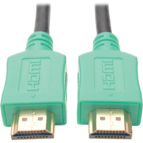 The P568-006-GN High-Speed HDMI Cable is ideal for digital signage, video presentations, point-of-sale displays, classrooms and other applications that display Ultra High Resolution (UHD) video and multi-channel audio. It connects HDMI-enabled source devices, such as computers and Blu-ray™ players, to HDMI-enabled displays, such as monitors, projectors and high-definition televisions. This cable supports UHD video resolutions up to 3840 x 2160 (4K x 2K), including full 1080p, and data transfer speeds up to 18 Gbps-the fastest bandwidth currently available over HDMI. When used with an Apple® digital AV adapter, it supports iPad2® video mirroring for playing games, watching videos or displaying presentations. Backward compatible with previous HDMI generations, the P568-006-GN works in all HDMI cabling scenarios.The six-foot molded 30 AWG cable features premium foil and braid shielding to deliver top-of-the-line signal quality and protection from EMI/RFI interference. Gold-plated green connectors ensure excellent conductivity. Integral strain relief ensures the cable and connectors last a long time. A flexible PVC jacket makes the HDCP-compliant cable easy to install in tight spaces.