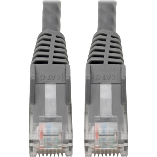 The N201-06N-GY Premium Cat6 Gigabit Snagless Molded UTP Patch Cable (M/M) is recommended for distributing data, voice and video through computers, network adapters, routers, servers, modems, hubs and switches in high-density data centers. Designed for fast transmission and excellent signal quality, this cable ensures peak performance throughout your local area network (LAN). It reduces impedance and structural return loss compared to standard 100 MHz wire.This six-inch gray cable is designed for 1000Base-T (1 Gbps Ethernet), 10/100Base-T (Ethernet), 100 Mbps TPDDI, 155 Mbps ATM, ISDN, voice, Token Ring Type 3 and EIA/TIA applications. Manufactured from 24 AWG four-pair stranded UTP with a rugged PVC jacket, the N201-06N-GY delivers speeds up to 550 MHz/1 Gbps and flawless signal delivery, while keeping near-end crosstalk levels to a minimum. The RJ45 short-body connectors'' snagless design protects the locking tabs from being damaged or broken off during installation. Corrosion-resistant gold-plated copper contacts provide maximum conductivity and minimize data loss. Integral strain relief gives the cable extra flexibility, reduces stress, and helps the cable and connectors move freely without cracking. Meets most other current industry standards, including IEEE 802.3ab, 802.5, ISO/IEC 11801 and ETL (Cat6 draft 11).