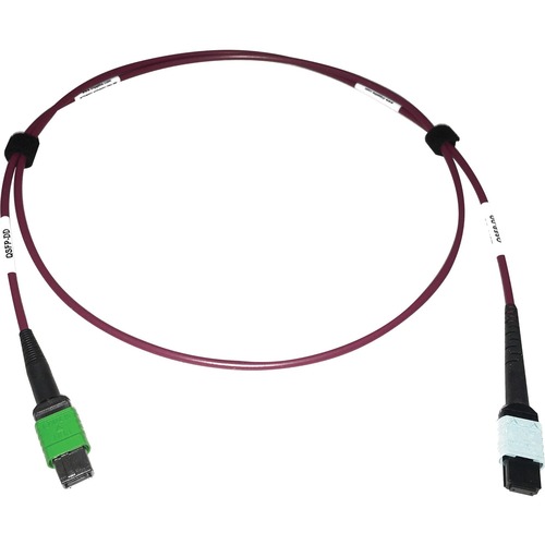 400 GbE Cable Supports Higher Bandwidths Needed for Next-Gen Data and Voice NetworkingAs the amount of traffic in data networks grows, so does the need for next-generation devices and fiber cables to support much higher bandwidths in cloud services, hyperscale data centers, telecom applications and equipment OEM companies. This multimode 50/125 OM4 cable is an ideal choice for 400G Ethernet applications up to 100 meters (at 850 nm). It has documented insertion loss and back reflection testing on every connector and attenuation loss that meets or exceeds current standards. 16-Fiber and 24-Fiber MTP/MPO Connectors Designed for the Latest QSFP-DD TransceiversThe MPO connectors have a wide parallel optical interface for use with the latest 400G QSFP-DD transceivers, making this cable an excellent solution for your high-density network application. The connectors are the same size as standard SC connectors, but 12 times denser, allowing vertical stacking in switches or patch panels where space is at a premium. Pull tabs make the cable easy to install or remove with one hand. Magenta Jacket Helps Avoid Misidentification That Can Cause Costly DowntimeThe OM4-rated cable has a magenta jacket, which is easy to identify quickly in a crowded patch panel or switch and helps prevent the cable from becoming accidentally disconnected. The three-millimeter ruggedized plenum-rated jacket has low smoke and flame characteristics, making it suitable for premise applications in ceilings, walls and ducts.