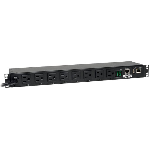 The PDUMH15NET2LX 1.4kW Single-Phase Switched PDU provides advanced network control and remote power monitoring with the ability to turn on, turn off, reboot or lock out power to each outlet. By reducing the frequency of on-site visits, these advanced remote capabilities can save you money and reduce downtime.The 1U PDU features eight switched NEMA 5-15R outlets with an included cord retention bracket to prevent cables from becoming accidentally disconnected. A 12-foot cord with NEMA 5-15P plug connects the PDU to a compatible AC power source, generator or protected UPS.The built-in Java-free HTML5-based LX Platform network interface enables full remote access for PDU status monitoring and email notifications via secure web browser, SNMP, telnet or SSH. It supports 10/100 Mbps auto-sensing for optimum communication with an Ethernet network. Optional EnviroSense2 modules (sold separately) provide a variety of environmental monitoring capabilities. Protocols supported include IPv4, IPv6, HTTP, HTTPS, SMTP, SNMPv1, SNMPv2, SNMPv3, telnet, SSH, FTP, DHCP and NTP.A digital ammeter allows you to monitor the total load in real time to ensure it remains well below maximum capacity with no danger of overload. The rack-mount PDU installs in 1U of space in EIA-standard 19-inch racks. You can also mount it vertically in 0U of rack space or on a wall or under a counter with the included brackets and user-supplied screws.