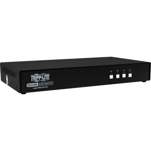4-Port KVM Switch, HDMI to DisplayPort, for Applications That Demand Secure Networks This 4K HDMI KVM switch is recommended for any government, military, financial or healthcare environment where tight security of sensitive data is of utmost importance in a world of constantly changing cyberthreats. Each KVM port is an electronically isolated channel, making it impossible for data to be transferred between connected computers through the KVM. The single-monitor switch supports crystal-clear UHD video resolutions up to 3840 x 2160 (4K x 2K) at 30 Hz. NIAP PP3.0 Certified to Meet Today''s Top Information Assurance Standards This KVM switch is certified by NIAP (National Information Assurance Partnership), which is operated by the National Security Agency (NSA), to the latest Common Criteria Protection Profile for Peripheral Sharing Switches Version 3.0. Discrete processing paths to each connected system prevent data leakage, transfer and crosstalk between adjacent ports. Peripheral isolation enables data to flow from device to host only. Top-of-the-Line Security Features Keep Your Data Safe Special protection prevents re-programming or re-reading firmware, so the switch''s KVM logic remains unaltered. The keyboard buffer clears automatically after data transmission, ensuring no information is left stored. Plus, you can only access connected computers via buttons on the switch''s panel. Other port-switching methods, such as On-Screen Display (OSD) and Hotkey Commands, have been excluded to further ensure data integrity. CAC Port Supports Biometric and Other Smart Card Readers The Common Access Card port supports smart cards, scanners and biometric readers, including fingerprint readers, to bolster security. You may assign and register specific peripherals to the CAC port, providing a secure connection for user authentication. Anti-Tampering Protection Prevents Physical Breeches If the housing is opened, internal anti-tamper switches will disable the unit, causing it to become inoperable and the front-panel LEDs to flash repeatedly. Seals on the enclosure will provide visual evidence of tampering. Maintains Constant Keyboard and Mouse Emulation for Smooth No-Delay Switching Full USB device filtering ensures support for keyboard and mouse only. This KVM switch also supports secure video emulation and EDID learning, which prevents unwanted data from transmitting through the DDC lines. Both keyboard/mouse and video emulation controllers restrict discovery of newly connected peripherals or monitors during switching operations, shielding your computers from potential vulnerabilities. TAA-Compliant for GSA Schedule Purchases The B002-HD1AC4 is compliant with the Federal Trade Agreements Act (TAA), which makes it eligible for GSA (General Services Administration) Schedule and other federal procurement contracts.