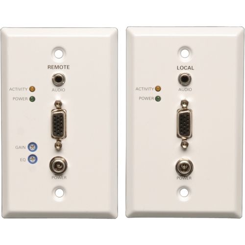 The B130-101A-WP-2 VGA with Audio over Cat5/Cat6 Extender Kit includes transmitter and receiver wallplate units that work in tandem to extend a VGA signal to to a projector, monitor or television. The kit is ideal for digital signs in schools, churches or retail applications where the video source is located farther than conventional cables allow. Attractive wallplate units eliminate cable clutter.Because compatibility issues can occur when EDID information is not properly communicated between the source and the display, the B130-101A-WP-2 includes an EDID copy feature. This enables the transmitter to store the display''s EDID information and send it to the video source, ensuring top-shelf compatibility.The B130-101A-WP-2 can extend a 1024 x 768 (60 Hz) signal up to 1,000 feet and a 1920 x 1440 (60 Hz) signal up to 500 feet when using 24 AWG solid-wire Cat5e/6 cable, such as Tripp Lite''s N022-01K-GY (Cat5) and N222-01K-GY (Cat6), to connect the two units. For optimal image quality between 500 and 1,000 feet, use zero-skew cable, such as Tripp Lite''s P524-01K. The RJ45-type wallplate jacks accept standard Cat5e/6 patch cables, so no 110 punchdown connection is required.You Can Also Connect Up To Three B132-110 Or B132-110A Remote Repeaters In A Chain (Using Cat5E/6 Cable) For A Total Of Five Vga Displays (One Local And Four Remote) And Full 1024 X 768 (60 Hz) Signal Extension Of 2,000 Feet.