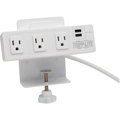 510-Joule Surge Protection for Home or Office Electronics The 510-joule rating means your computer, printer, scanner, external hard drive and other sensitive electronic components are protected against strong surges and spikes. This power surge protector with USB ports features full normal mode (H-N) and common mode (N-G/H-G) line surge suppression. It filters out disruptive EMI/RFI line noise that can cause equipment damage or data loss and exceeds IEEE 587 Category A and B surge suppression specifications. Charges a Wide Range of Electronic Devices This 10-foot surge protector features two USB ports that produce 3.1A of combined power to charge your mobile devices, including smartphones, tablets and MP3 players. A top storage shelf holds smartphones and other small devices while they''re charging. Fits Effortlessly Into Your Workstation This 3-plug surge protector mounts to a clamp that attaches to most desks, tables and flat surfaces, bringing power and device charging to your desktop. The 10 ft. power cord has a NEMA 5-15P plug and fits through the back of the clamp to reduce cable clutter. Lifetime Limited Warranty and Ultimate Lifetime Insurance This three-outlet surge protector comes with a lifetime limited warranty and is backed by Tripp Lite''s $20,000 Ultimate Lifetime Insurance for any connected components damaged by a power surge (U.S., Canada and Puerto Rico only).