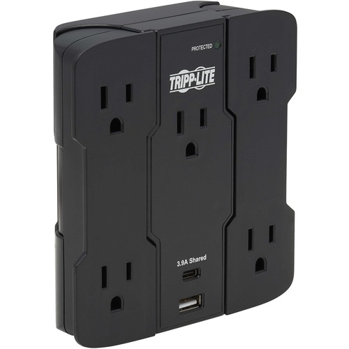 5-Outlet Surge Protector with USB Charging Safeguards Your Sensitive Electronics Ideal for your home, office, retail or industrial workstation, this Safe-IT™ surge protector features a surge protection rating of 1050 joules to defend your valuable electronic components against power surges and spikes. Because residential power outlets have three wires-hot line (H), neutral (N) and ground (G)-the SK5BUCAM protects all five, covering the two protection modes: full normal mode (H-N) and common mode (N-G/H-G). Rotating NEMA 5-15R Outlets Accept a Wide Range of Electronic Devices Plug your computer, printer, wireless router, desk lamp and other home/office electronics into five NEMA 5-15R outlets to protect them against dangerous surges, spikes and line noise. Four of the outlets rotate 90 degrees on two bars of two outlets each to allow greater flexibility in placing connected devices or accepting bulky transformers without blocking adjacent outlets. 2 USB Ports Share 3.9 Amps of Charging Power One USB-C port and one USB-A port are available for charging your smartphone, tablet or other USB mobile devices. They share 3.9A for charging multiple devices at the same time. Premium Protection from EMI/RFI Line Noise Helps Your Equipment Perform Better This surge protector filters out disruptive EMI (electromagnetic interference) and RFI (radio frequency interference) line noise that can disturb your electronics and inflict hardware damage or data loss. This EMI/RFI filtering also helps your connected components perform better and last longer. Includes the Latest Safety Features to Maintain Your Equipment''s Well-Being The unit plugs directly into a wall outlet, avoiding annoying cord clutter. An integrated 15A circuit breaker protects outlets and automatically cuts power to outlets if protection circuit is incapacitated, preventing equipment damage and indicating replacement is required. A green LED confirms at a glance that your connected equipment is protected. Antimicrobial Protection Helps Provide a Safer, Cleaner and Healthier Work Environment The SK5BUCAM features antimicrobial protection that helps resist the growth of bacteria, viruses, fungi, mold and mildew.