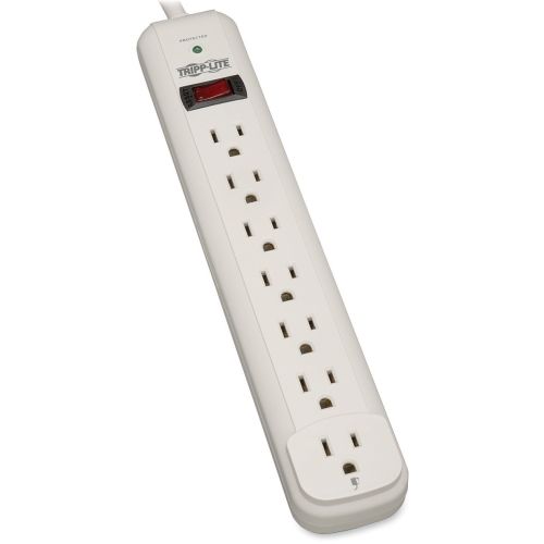 Surge protector with seven outlets is designed to protect electronic equipment against surges, spikes and line noise. Design accommodates one bulky transformer without blocking remaining outlets. Surge protector offers EMI/RFI line noise filtering, protection up to 1080 joules, 12'' cord, diagnostic LEDs and keyhole supports for wall mounting.