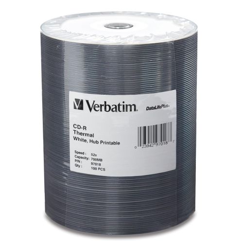 For sharp, clear graphics using color thermal printers the preferred choice is Verbatim''s DataLifePlus CD-R White Thermal Printable, which supports full-surface edge-to-edge printing. Compatible with color thermal printers including Rimage Everest technology, these 52x speed certified CD-R discs have a white, thermal, scratch resistant surface. This surface optimizes thermal printing for superb high-resolution reproduction of graphics text and logos. Ideal for CD duplicating, Verbatim DataLifePlus CD-R color thermal printable discs are available in 50-disc spindles. Discs feature Verbatim''s innovative ''Super Azo'' dye providing long-term data security and superior resistance to UV irradiation. As with all Verbatim optical products, these CD-R thermal printable discs are backed by a limited lifetime warranty.