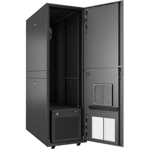 The Vertiv VRC-S VRCS3300-120V is a 42U rack that can rapidly convert any space into a pre-engineered micro data center with its own power distribution unit (PDU) and air cooler. This integrated system is equipped with the Vertiv VRC100KIT, a 3.5kW (12000 BTU) self-contained server rack cooling unit that saves floorspace and provides the sensible cooling that your IT gear needs. It also has the Vertiv Geist Switched Rack PDU (rPDU) NU30021, which has 24 NEMA 5-20R outlets, an L5-30P plug, and a capacity of 2.7kW. This rPDU comes with outlet level switching and sensors that relay environmental data to users. The VRC-S also provides ease of access since the Vertiv Intelligence Director enables remote management for the whole system. Vertiv offers optional installation services. Designed for small computer rooms and edge locations, it can be shipped within 3-5 business days.