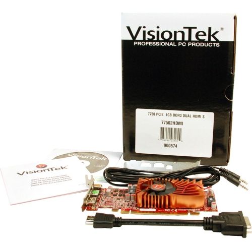 Introducing the Visiontek Radeon 7750 Dual HDMI, + mini Displayport graphics card AMD eyefinity 3 monitor support (Windows Vista or newer). Short Form Factor design fits in today''s Low Profile desktops and workstations (short bracket mounted on card). Card is convertible to standard ATX design with (included) tall bracket for standard chassis as well. Single slot, Triple Monitor support is now available for your Small Form Factor PC. The VisionTek Radeon HD7750 Dual HDMI, mDP 1GB SFF combines a radically new and efficient ultra-threaded core architecture with AMD''s revolutionary AvivoTM video and display technology. Full support for Microsoft DX 11. The VisionTek Radeon HD7750 Dual HDMI, mDP 1GB SFF delivers exceptional visual performance for all types of PC entertainment and productivity. Ideal for moderate gaming, multimedia, office productivity, and workstation applications. With AMD Radeon™ HD7750 and the introduction of Discrete Digital Multi-Point Audio (DDMA), Radeon™ HD 7750 Series GPU enable new and interesting multi-display applications. DDMA enables Radeon™ HD 7750 Series GPU with the ability to output multiple and independent audio streams simultaneously through digital interfaces that support audio, such as DisplayPort™ and HDMI®.